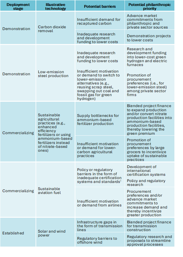 A first step in identifying barriers is to assess a green alternative’s deployment stage. For the purposes of this article, we can classify the deployment of green alternatives in three stages. First, in the demonstration stage, technologies have proven technical feasibility but limited, if any, commercial deployment. Second, in the commercializing stage, technologies have some initial commercial activity (e.g., early revenues, private investment) but are not yet cost-competitive or deployed at scale. And third, in the established stage, technologies have broad market penetration, competitive costs, and mature supply chains. For established green technologies like solar and wind, lower-interest philanthropic capital may be sufficient to make solar and wind preferable in the eyes of investors. By contrast, for technologies in the demonstration stage like carbon dioxide removal, pilot projects and further research and development are likely necessary to lower the green premium.